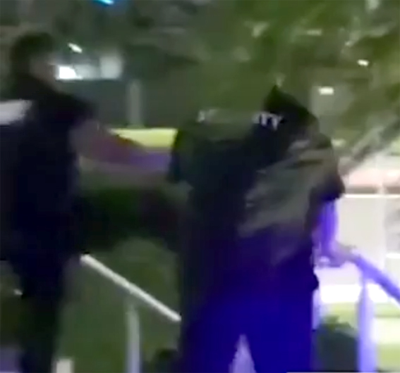 The woman was shaking her finger at the bald guard, who shoves her back down the stairs. She stays on her feet and comes back, only to be shoved bodily down the stairs – risking serious injury.
