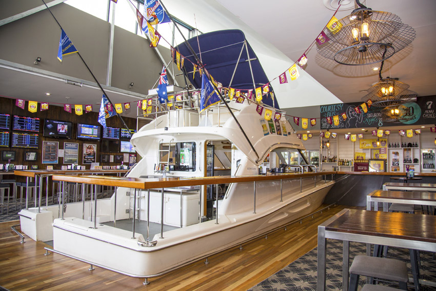 Situated adjacent to the bustling M1 motorway, near the Gold Coast’s three big theme parks, the hotel marks the road to the Gold Coast mariner, and this was chosen as its theme, which included installation of a 40-foot Rivera Cruiser into the main bar.