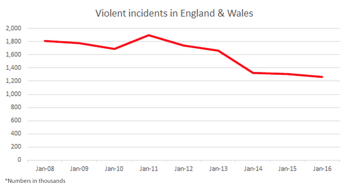 While the ONS figures are the total of both domestic and non-domestic violence, they equate to a startling rate of one violent incident per 51 people in 2016, based on England and Wales’ collective population amounting to 68 million that year.