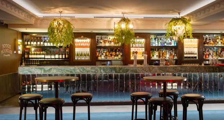 Up flights of stairs beside the street level Hotel, Boogie Mountain greets patrons with mirrors and neon and bold red velvet booths, beneath the sounds of the likes of Talking Heads and Iggy Pop, and ‘Vinyl-Only’ on Thursday nights, with all-you-can-eat poutine.
