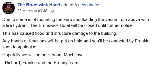 Live music icon the Brunswick Hotel has closed indefinitely, after a freak accident saw a fire hydrant flood the building from above.
