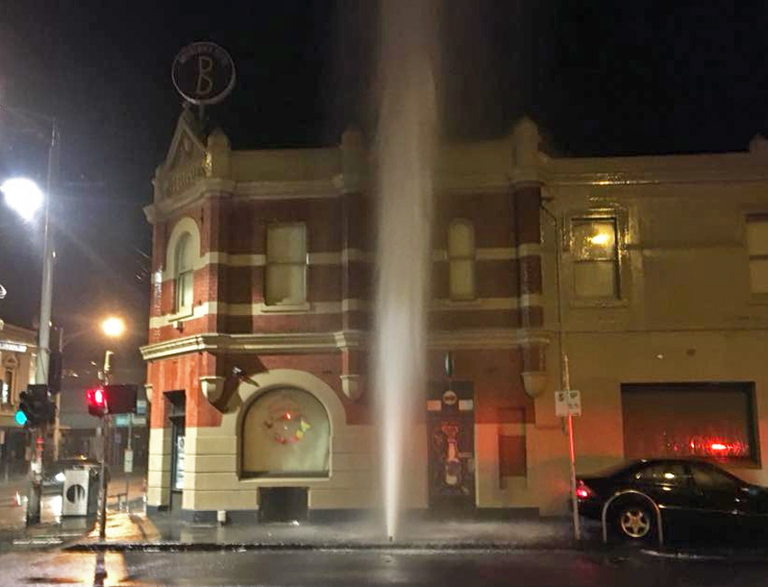 In the early hours of Thursday morning (22 March), a car struck a fire hydrant outside the popular pub, on the corner of Sydney Road and Weston Street, in Brunswick.