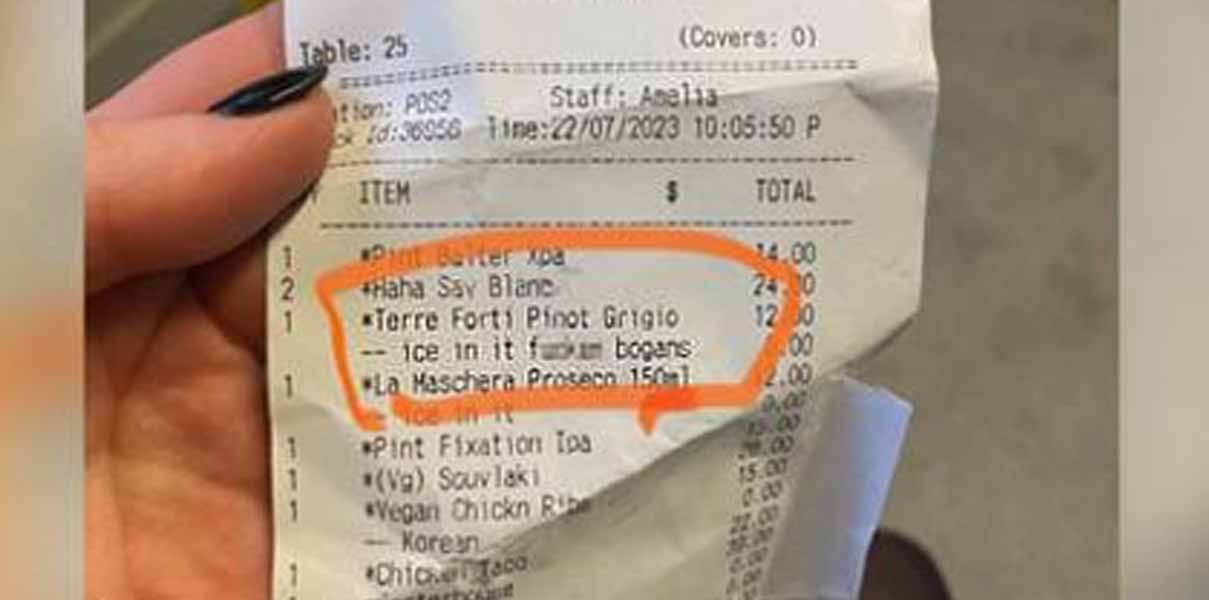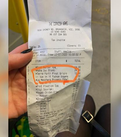 Finishing their visit and receiving their receipt, the customer was shocked to see a note about the ice in the wine, being for the “fucking bogans”.