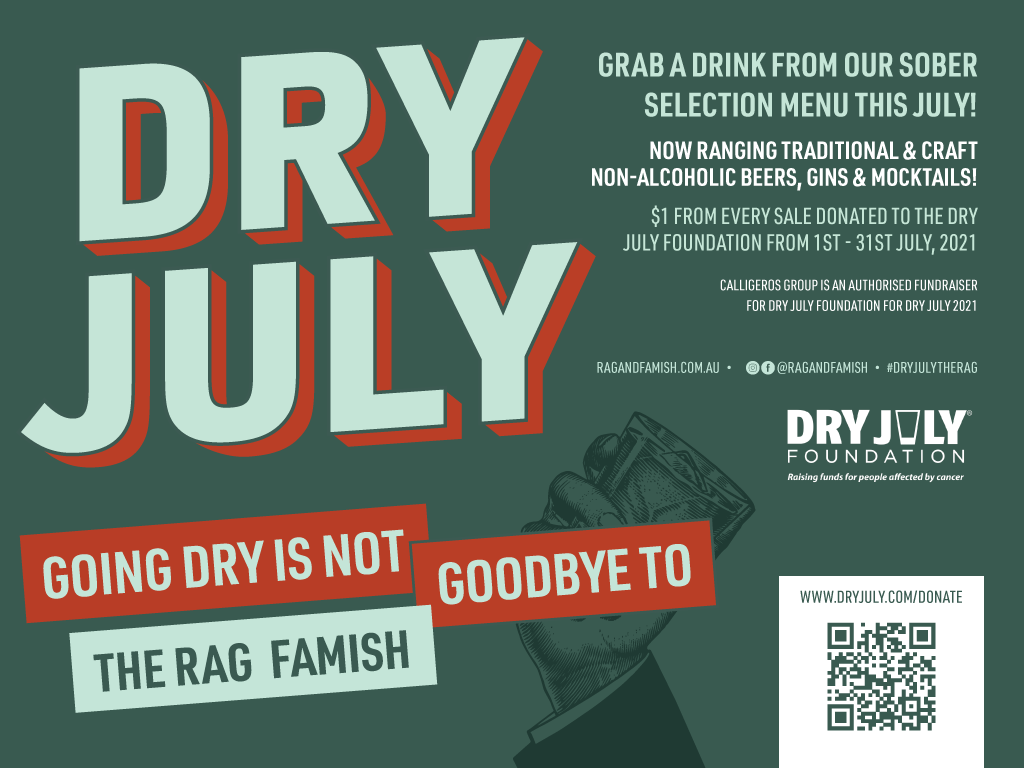 Dry July will be going down in Calligeros venues the Rag & Famish Hotel and Terrace Hotel, in North Sydney, the Trinity Hotel in Surry Hills and Tilly Mays upstairs, and the Bellevue Hotel in Paddington.