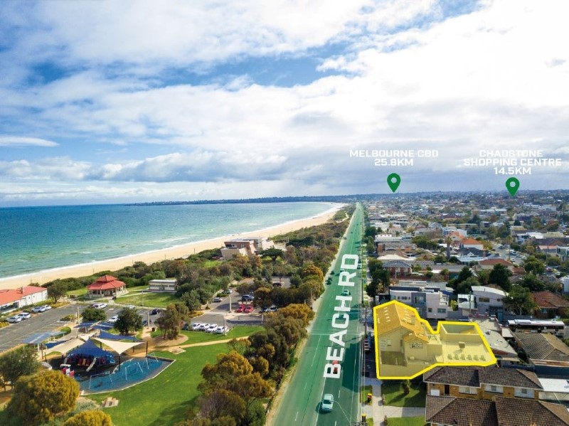 The pub occupies a prime corner site of 646sqm on Beach Road, directly opposite Mordialloc Beach, with views across Port Phillip Bay, a 1am licence and mixed-use zoning.