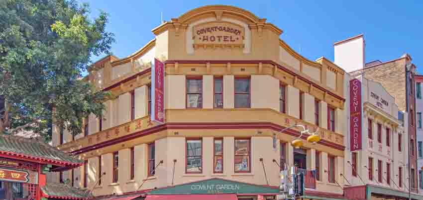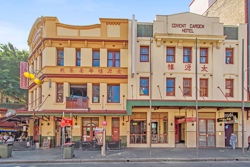 The three-storey dual-fronted Covent Garden Hotel was opened by Tooths & Co in 1911. The imposing building stands sentry at the gateway to Chinatown’s famous Tumbalong Boulevard, in Haymarket.