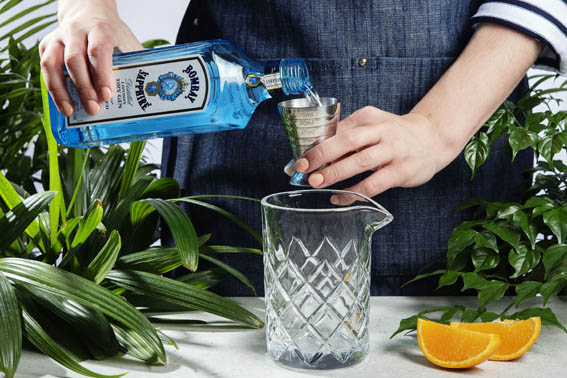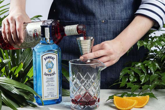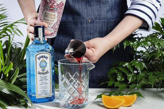Step 2 – Add Bombay Sapphire Gin, Martini Rubino and Bitter to the glass