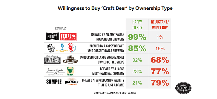 - 99 per cent are happy to buy craft beer from an independent Australian-owned brewery, while just 23 per cent are happy to buy craft beer from a large multi-national company