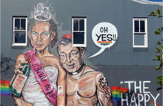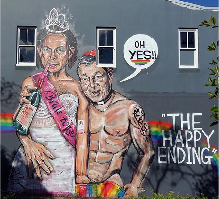 More than 60 per cent of participants indicated a Yes response and Marsh pre-empted this with a contentious depiction of Abbott in a wedding dress and sash, his hand down the pants of a shirtless and tattooed muscle-bound Pell, who is feeding Tony a bottle of Grange with a protruding penis straw.