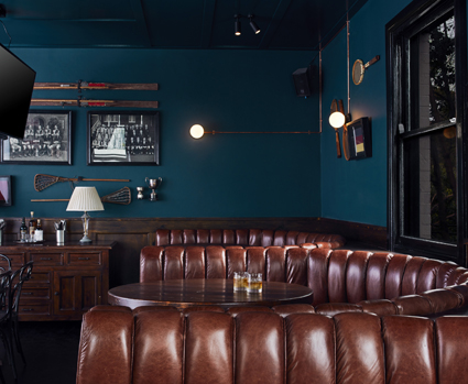 Upstairs is the Athletic Club, fashioned as a “time capsule” of a gentleman’s sports club, with dark panelling, leather seats shaped in roomy booths, a poker table, and historic sporting memorabilia and television screens lining the walls. It has private bottle lockers behind the bar and champions dark spirit cocktails and boilermakers, such as the ‘Prescription’ or Bridge Road Robust Porter & English style rum