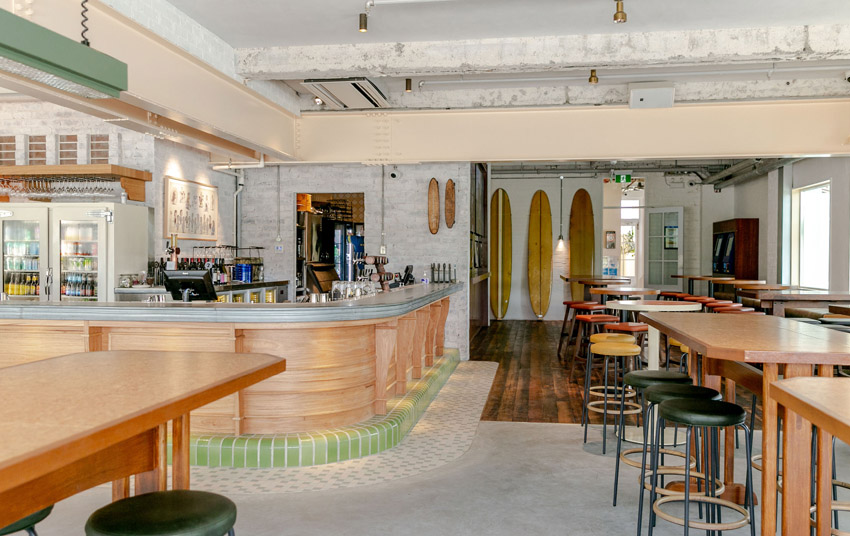 Phase one of renovations gutted the ground floor, removing walls and exposing heritage elements such as archway windows and the original staircase. Designed in collaboration with Alexander & Co, the new Harbord Hotel takes cues from Freshwater’s history – notably its unique claim as the birthplace of surfboard riding in Australia.