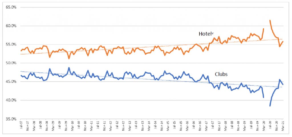 Queensland hotels and clubs gaming market share June 2007 to March 2021. Image: Wohlsen Consulting