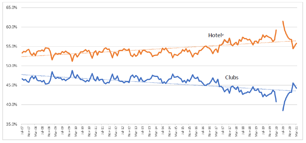 Since March 2017 there has been a noticeable trend toward greater market share by hotels, largely due to success with games that did not work as well in clubs. But the pattern has been disturbed and may not find normalcy anytime soon.