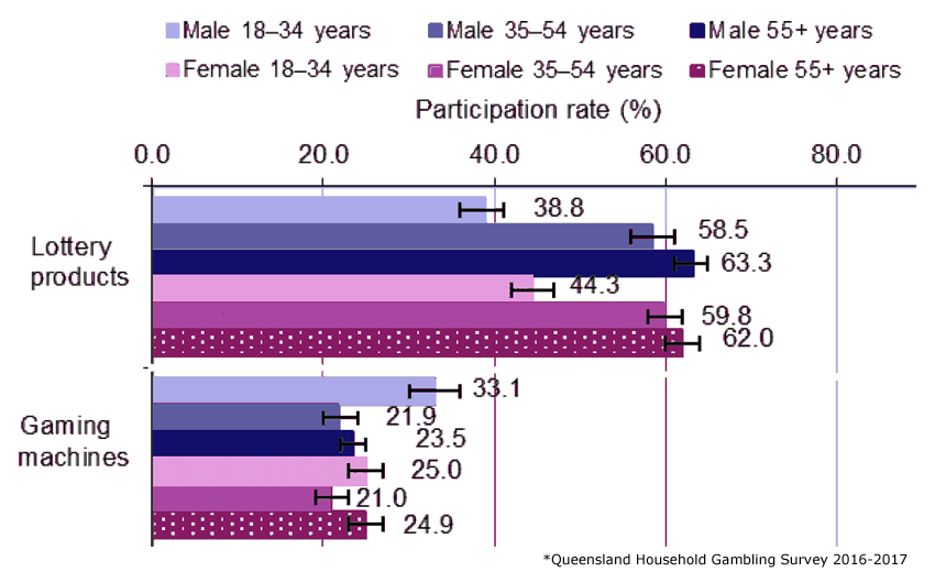 The Queensland Household Gaming Survey has demonstrated for a number of years that the greatest participation levels in gaming machine play – both males and females – is the 18 to 35-year-old segment (see below). Consumer marketing also tends to find this demographic as more likely to seek the ‘latest and greatest’ play options.