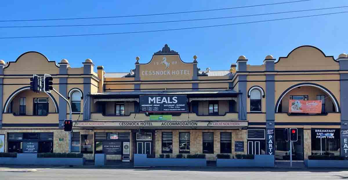 Built 1908, the pub is a grand country hotel in a prominent central site in Cessnock, close to the famed vineyards of the Hunter’s wine country.