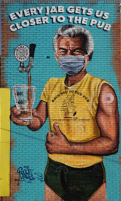 The mural depicts Hawke wearing a mask, giving the thumbs up while he fills a schooner glass that represents the population vaccination rate. The glass will reportedly be topped up as more Australians get vaccinated, toward a full beer for the goal of 80 per cent.