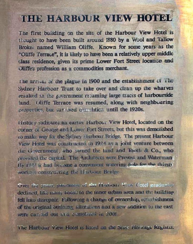 The HVH is one of the few freehold hotels in The Rocks, with most titles held by the Sydney Harbour Foreshore Authority. It was rebuilt in its current form in 1924 for the use of construction workers on the Sydney Harbour Bridge.