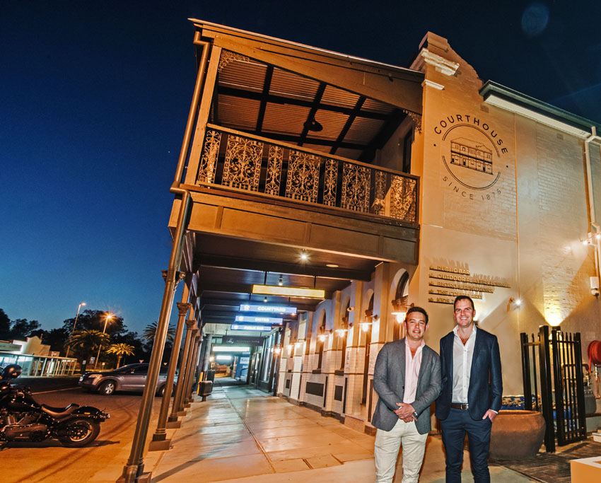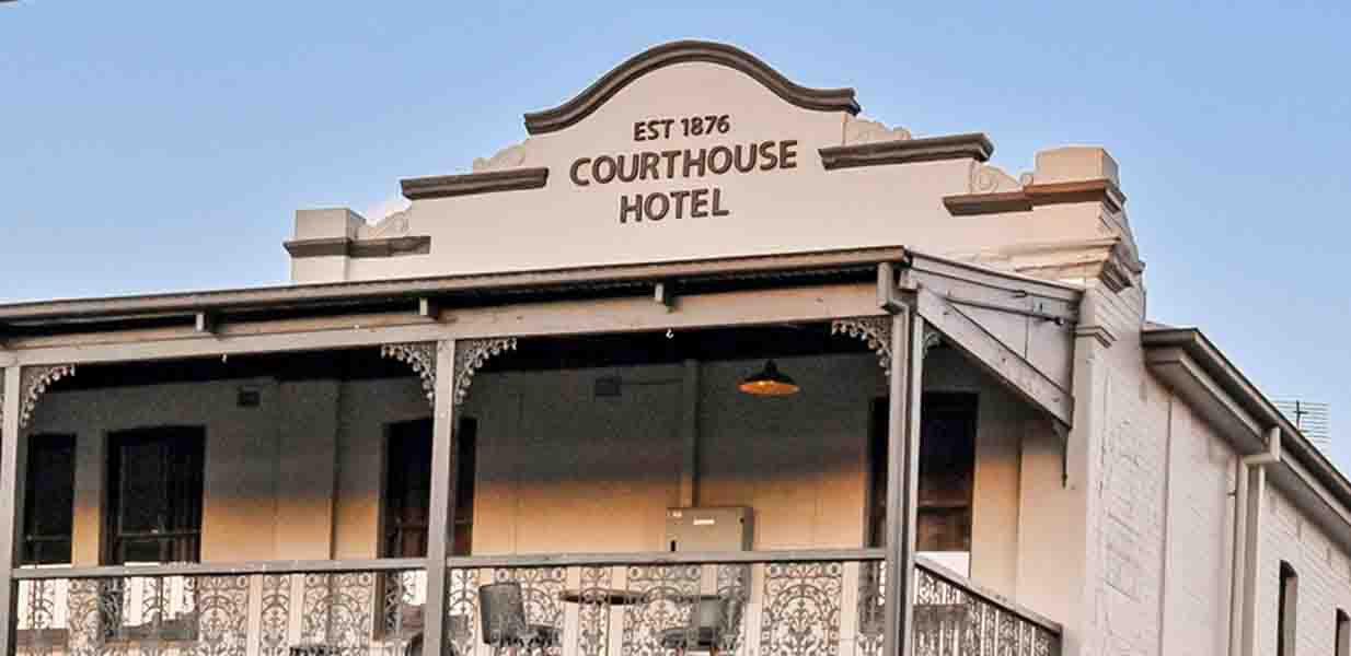 The Courthouse is a stately two-storey brick structure featuring an ornate Georgian iron lacework balcony across the upper level. Built 1876 it is the region’s oldest pub.