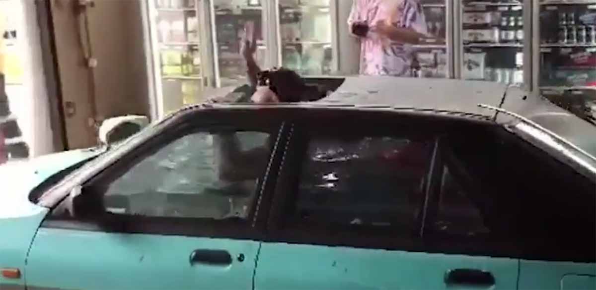 Bottleshop attendee Tony reports it was a stinking hot day and the group – being followed by a second car, filming the stunt – bought stubbies of beer before heading off again.