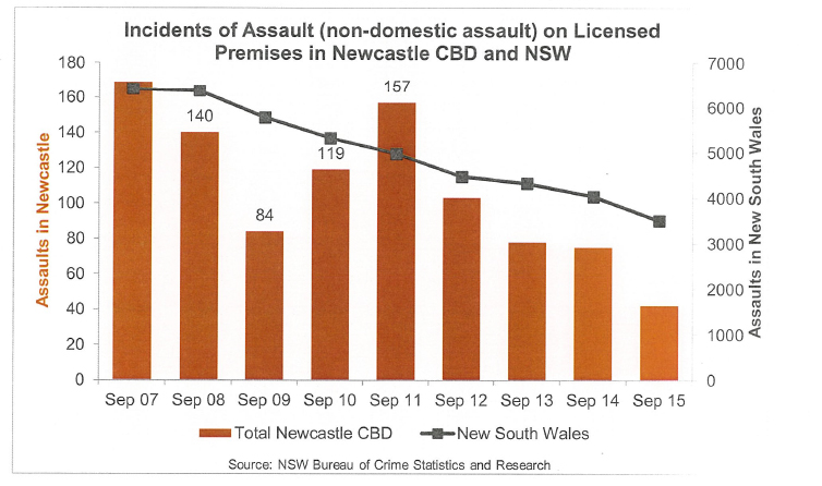 Assault figures for Newcastle versus the rest of the State show mixed results but largely the same trend of continual fall in incidents of non-domestic assault.