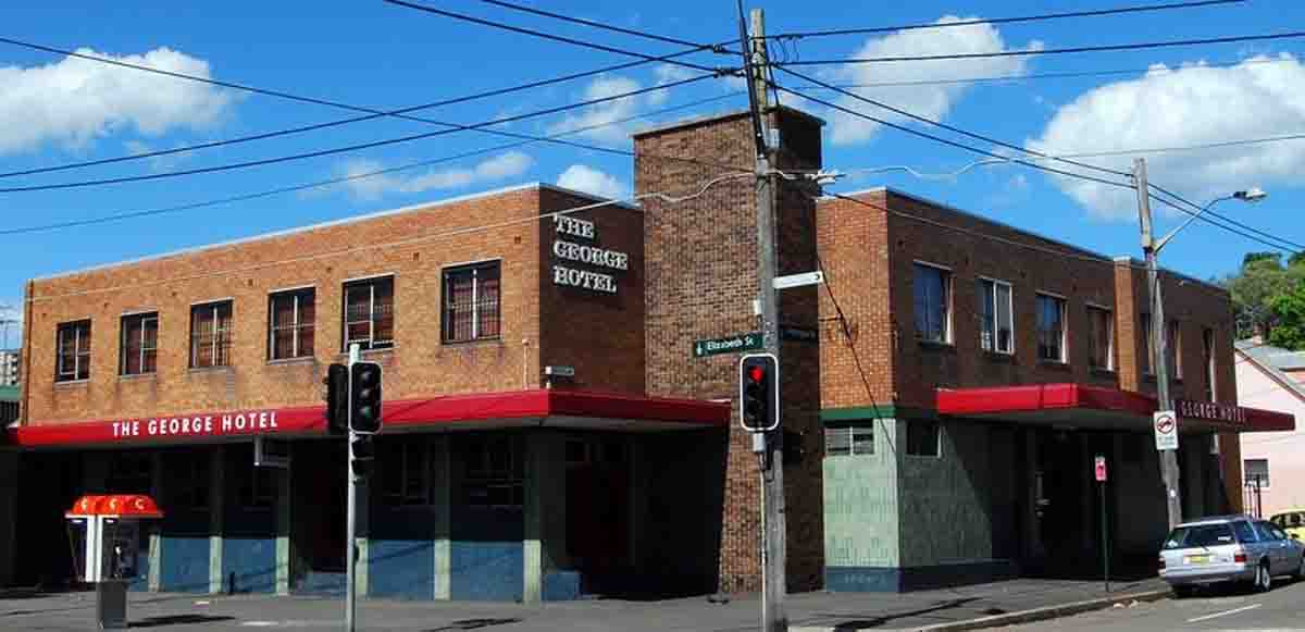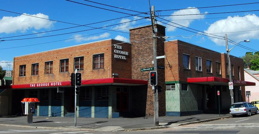 The corner of Elizabeth and Wellington Streets in Waterloo used to be a small corner pub flanking three terraces. In the early 60s Tooth & Co purchased the lot and in 1965 opened the stark, almost modernist George Hotel.