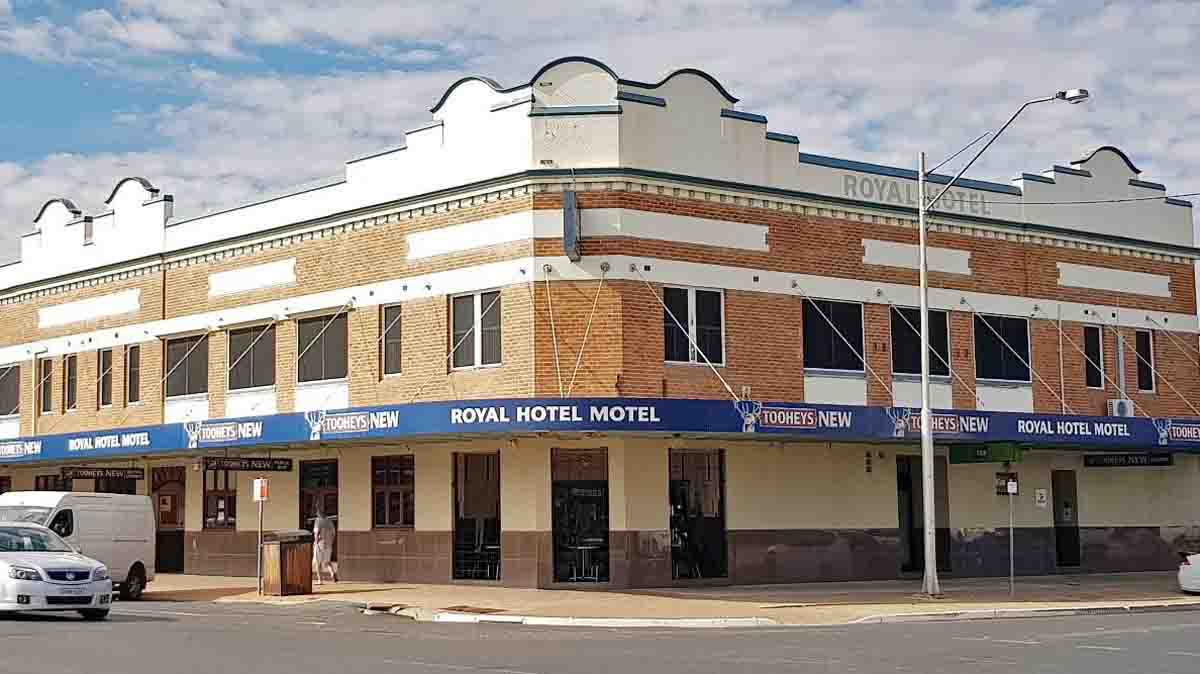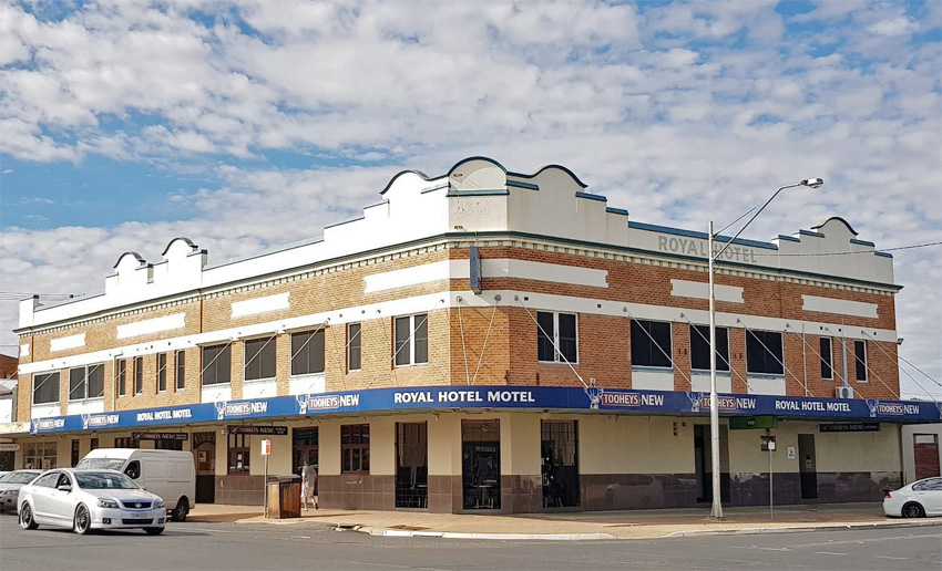The Royal of Moree is a large, two-storey brick pub with a generous Federation-style parapet, on a prominent corner. It offers public bar with TAB, commercial kitchen, bistro, gaming room with 15 machines, plus a freestanding motel with 16 rooms.