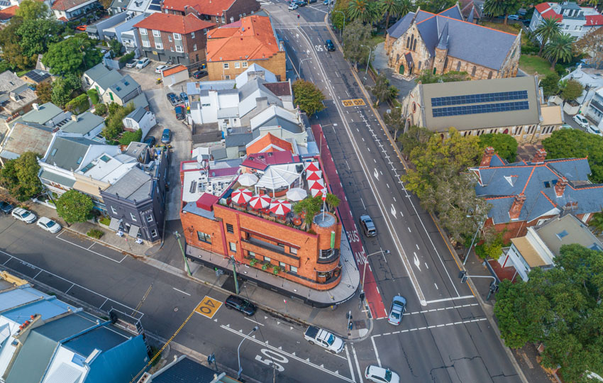 Crowning the intersection of Paddington-Woollahra since the 1880s, the three-storey pub boasts two street frontages, over Oxford St and Jersey Rd.