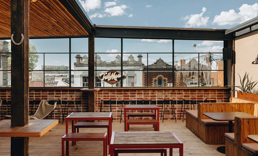 Found in the heart of inner Melbourne’s Abbotsford, Full Moon Fever is the “missing piece” to the Lulie Tavern puzzle, and ready just in time for summer to welcome all comers. A lift to the rooftop finds a space decked with a retractable roof and a cosy outdoor wood burner essential for year-round enjoyment in the city of Melbourne.
