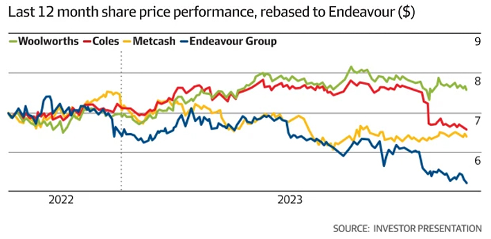 Providing a comparison with its competitors, a series of graphs shows Endeavour’s share price down 25.4 per cent in the prior 12 months.