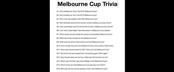 At PickTheCupWinner.com.au we are offering a free download of 20 Cup trivia questions, innovative marketing ideas and informative videos of Melbourne Cup horses.