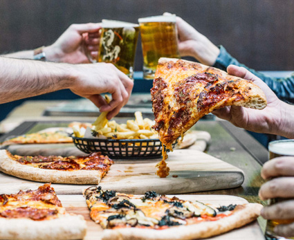 The visual is backed by all the menu trimmings of hotdogs piled high with bacon, sauce and oozing cheese, and extra-large New York-style pizzas, washed down with classic and craft beers.