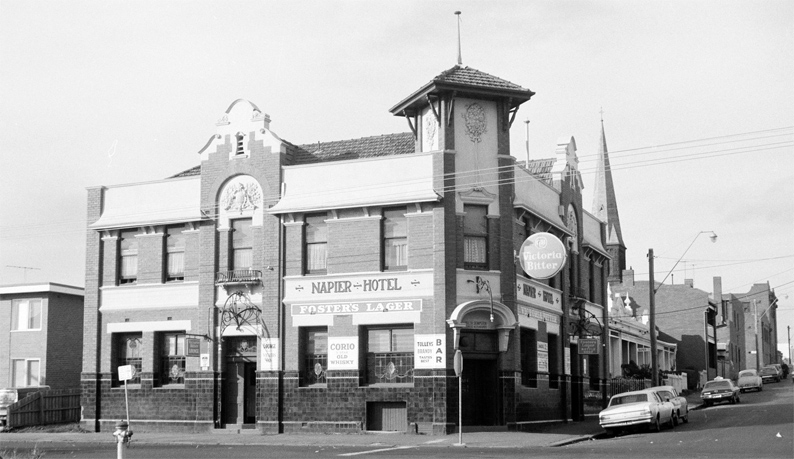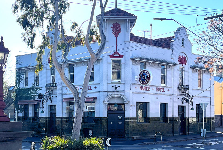 Established in 1866 under the same moniker on the corner of Moor and Napier Streets, the former Napier Hotel was replaced in 1916 with the striking current structure, built for Carlton & United Brewing, featuring two façades on the two-storey brick hotel that are joined at a splayed corner topped by a square roof tower.