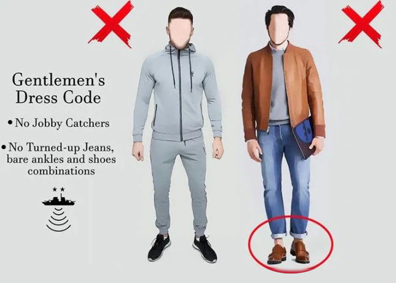 The code consists of a ban on tracksuits with elasticised cuffs, known in Scotland as “jobby-catchers”, as well as the increasing trend of rolled-up jeans over shoes without socks, displaying ‘mankles’.