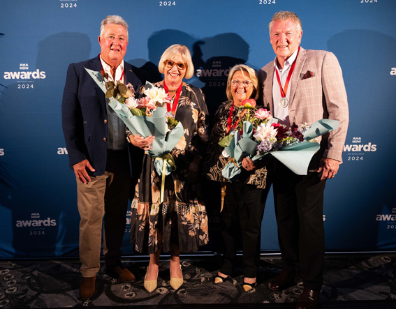 A standing ovation met the announcement of popular Central Coast hoteliers Peter and Jane Harris, and Gary and Kerry Narvo, as this year’s inductees into the AHA NSW Hall of Fame, receiving the Cyril Maloney Medal. This marked the first ever time in the Association’s history that two married couples were inducted.