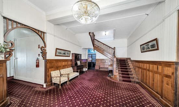 On the upper level there are accommodation wings, with 10 separate rooms, ensuites and bathrooms, and wrap-around timber balconies overlooking main street, plus a four-bedroom self-contained manager’s residence.
