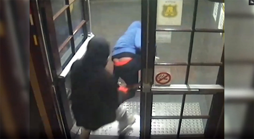 The first man jumped over the bar, while the second, with the knife, went into an adjacent room and ushered out three men, forcing them to lie on the floor near the bar.