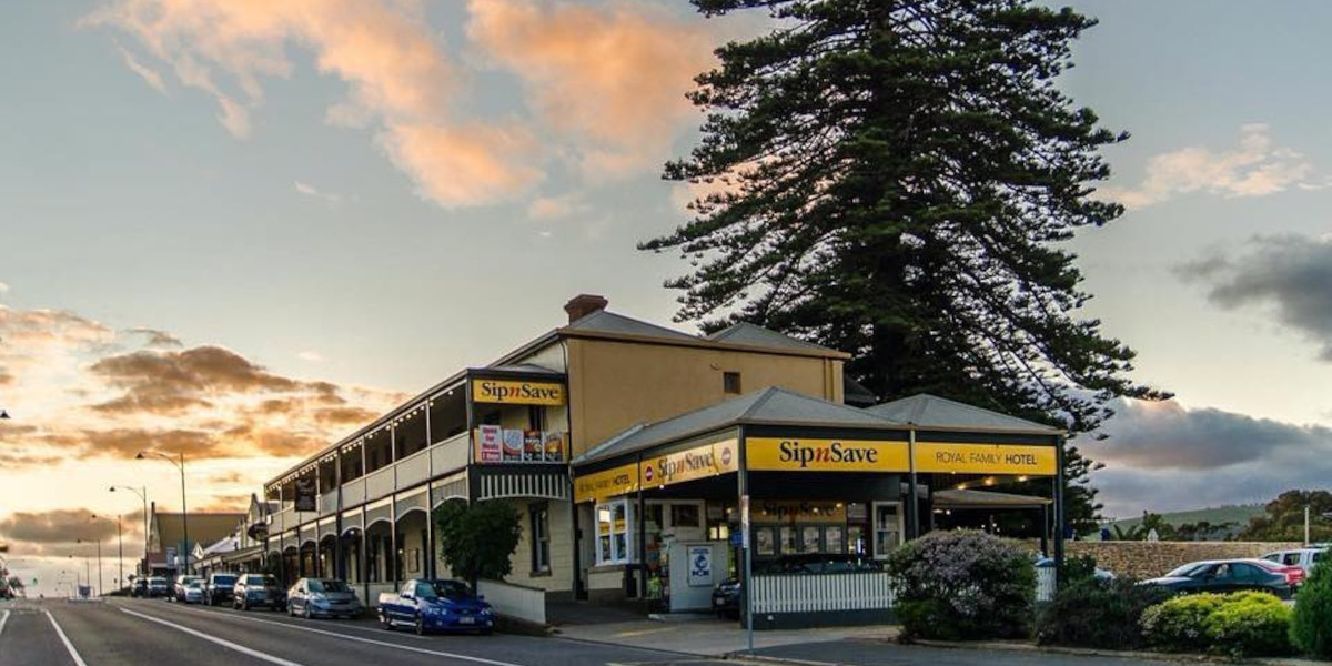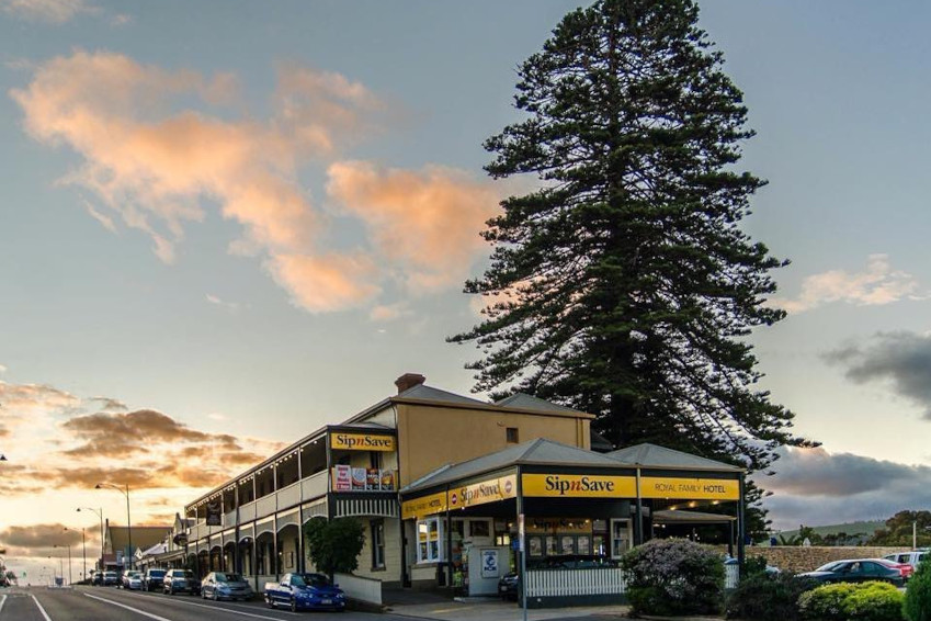 Just after 1:30am Saturday morning, a blue Ford sedan was recorded reversing at speed (below) into a group of people outside the Royal Family Hotel in Port Elliot.
