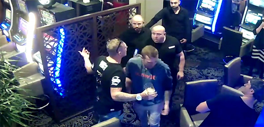 The camera footage shows Rose hurl a schooner glass at the guard, hitting him in the right side of the head, before the two mates attempt to retreat to another part of the venue. They were escorted out shortly after and held while emergency services arrived.