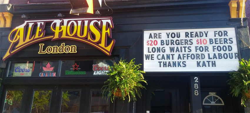 Notice of the scheduled 31 per cent increase over the next two years has proven too much for one pub, in London, Ontario. Owner of the Ale House, Alex Petro, has taken to commentary on the wage hike, including on his exterior noticeboard.