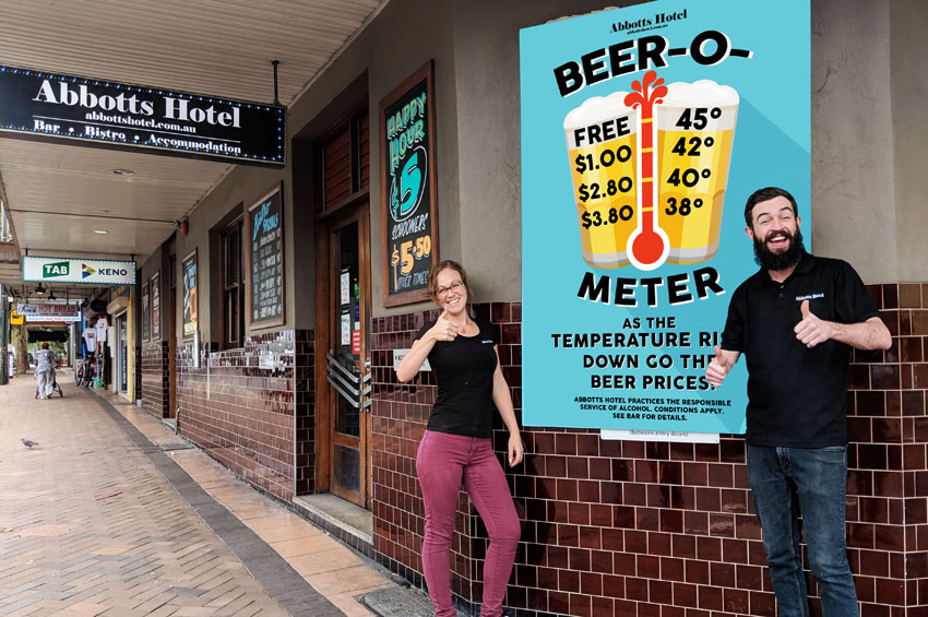 Last summer the ever-active Abbotts Hotel in Waterloo launched its grace-saving Beer-O-Meter to huge local acclaim, offering $3.80, then $2.80, then $1 and eventually free schooners of beer as the outside temperature reached 38, 40, 42 and 45-degrees (respectively).