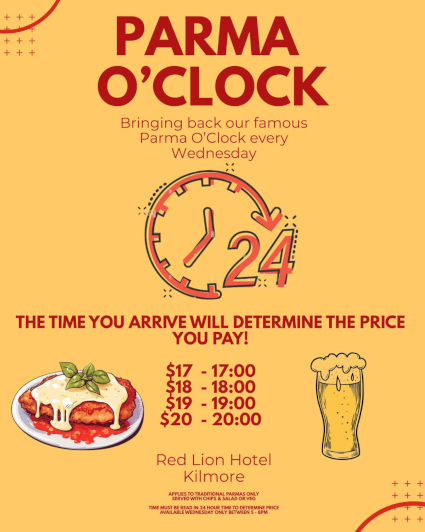 The Lion was quick to reinstate its popular ‘parma-o-clock’ night, where the price of the parma depends on the time the diner arrives, in 24-hour time. For example, a patron arriving at 6pm (18:00) would pay $18, while a patron arriving at 8:00pm (20:00) would pay $20.