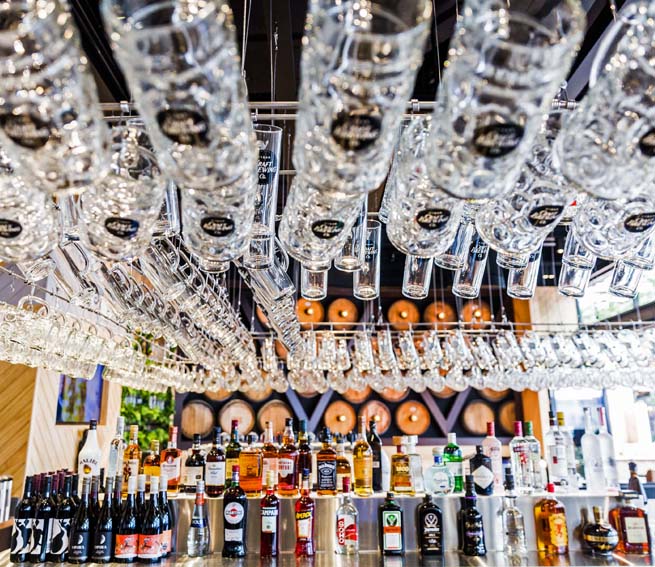 A signature stein chandelier hangs above a long, timber bar, between feature walls of sprawling greenery and rustic beer barrels for warmth of atmosphere, lit by natural light from ceiling-high glass windows. Large-screen TVs bring some modern aesthetic and a schedule of live sports.