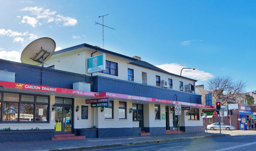 The Royal Hotel occupies a generous 1,760sqm block on the prominent corner of main roads Windsor and East Market Streets, Richmond, where a licensed premise has stood since 1848.