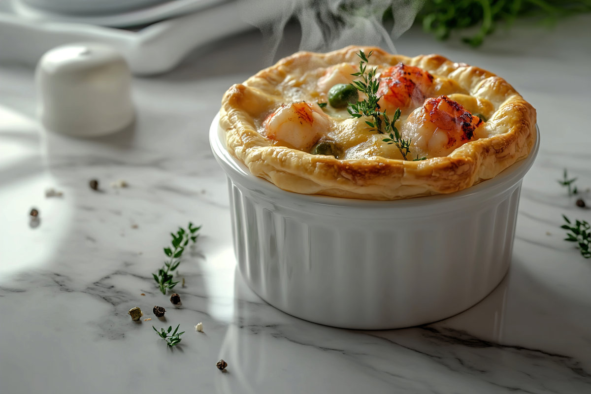 A fantastic alternative to red meat, the seafood pot pie can be adjusted to suit for availability, using all fish or all shellfish, or a combination as desired.