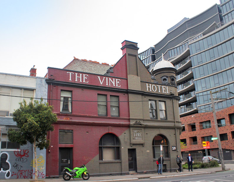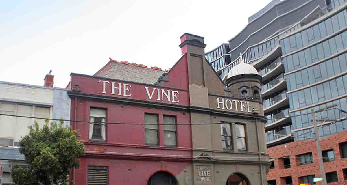 In 1869, the Caledonian Hotel was the first built on the site of what is now the Vine Hotel, on the corner of Wellington and Derby Streets in Collingwood, in the eastern heart of Melbourne. Its name was changed the following year to the Eight Hours Hotel, and again in 1875 to The Vine.
