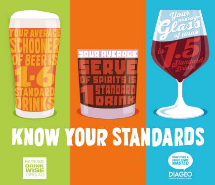 The material shows clearly the number of ‘standard’ drinks in ‘standard’ serving sizes – such as a schooner of beer or typical glass of wine – to help ensure patrons, particularly young drinkers, are aware of how much alcohol they are actually taking in before they have ‘too much’.