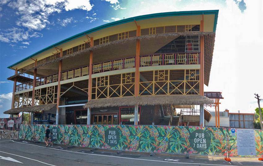 With legal disputes now reputedly settled, the Sunshine Coast pub has finally shed its shrouded scaffolding, unveiling a distinctly different look inspired by the tropics, with its own waterfall, twice the capacity, and strictly vertical walls.