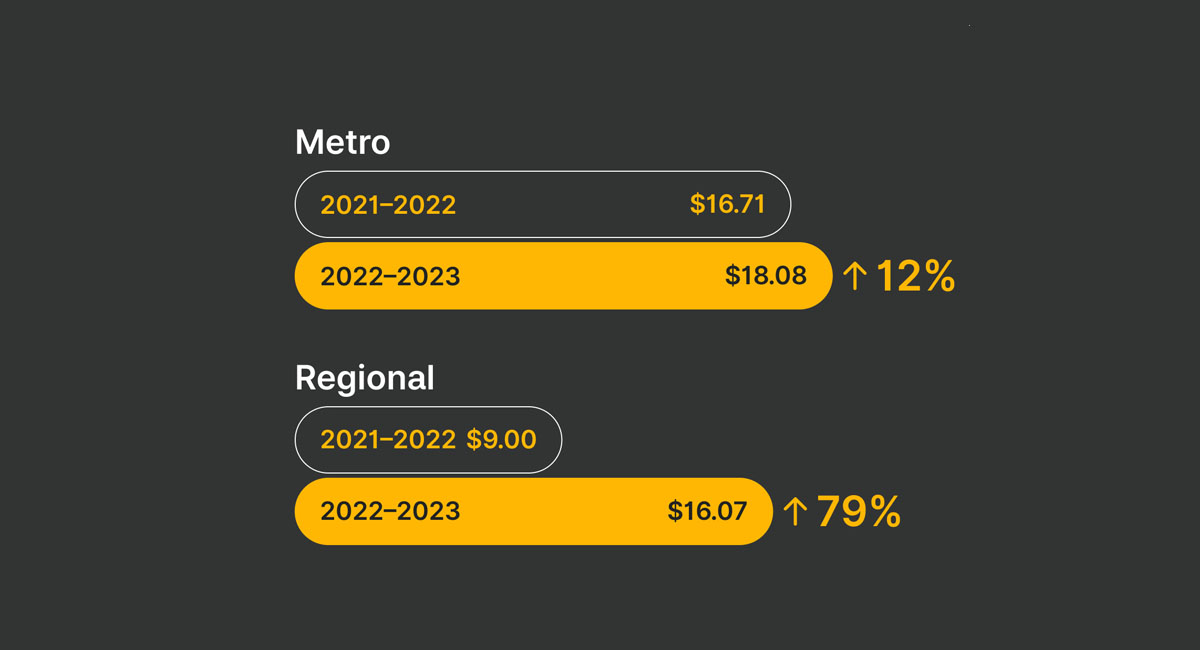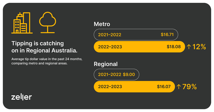 Unsurprisingly, gratuities are more pronounced in metro areas, by around 12 per cent, but the trend is also taking hold in regional Australia, recording an average increase of 79 per cent YoY, from $9 to $16.07, against $18.08 in cities.