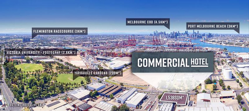Yarraville’s Commercial Hotel occupies 1,538sqm at the junction of Whitehall and Hall Streets, around seven kilometres due west of the Melbourne CBD.