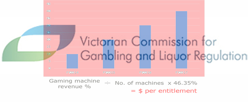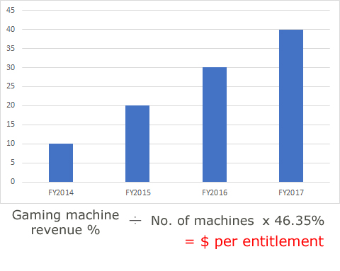 The amount is calculated according to the average earning per machine in financial years 2013-17, the formula rate increasing each of the four years, from ten to forty per cent. This figure is then multiplied by a ‘State Multiplier’ (46.35 per cent) to arrive at the entitlement price.
